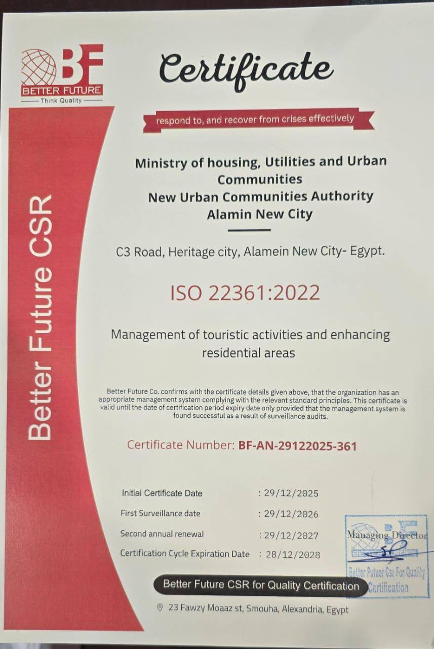 ومن جانبه أكد الدكتور مهندس محمد خلف الله رئيس جهاز مدينة العلمين الجديدة والمشرف على جهاز القرى السياحية أن الحصول على شهادة الأيزو الدولية يُعد خطوة فارقة في مسيرة الجهاز، ويجسد إلتزامه الكامل بتطبيق أفضل الممارسات العالمية في إدارة الأزمات والمخاطر، وتحسين جودة الخدمات، ورفع كفاءة الأداء المؤسسي، بما يحقق أعلى معدلات الانضباط والشفافية والإستدامة.