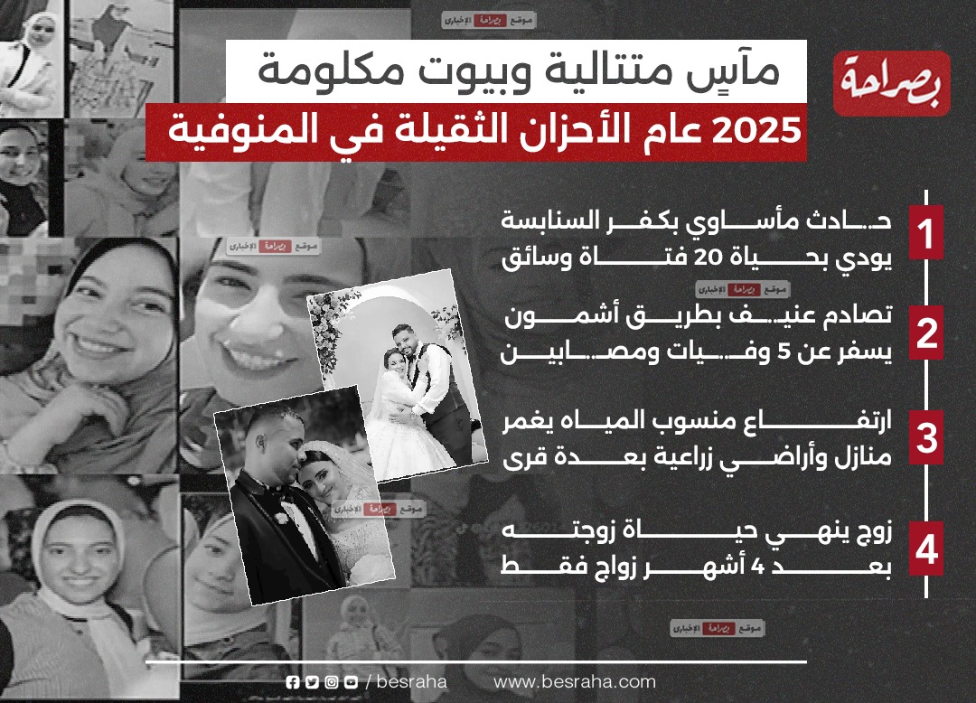 لم يكن عام 2025 عامًا عاديًا على محافظة المنوفية، بل تحوّل إلى سلسلة متتالية من الصدمات القاسية التي وجعت القلوب وهزّت المجتمع، بعدما شهدت المحافظة حوادث مأساوية وجرائم أسرية وحالات فقد جماعي جعلت الحزن عنوانًا عامًا، وفتحت ملفات خطيرة تتعلق بالطرق، والأمان المجتمعي، والصحة النفسية.