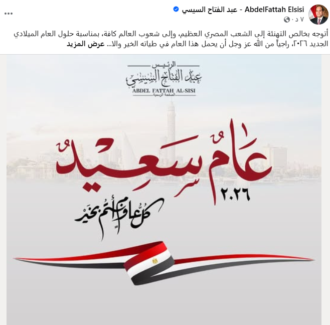 قال الرئيس عبد الفتاح السيسي رئيس الجمهورية عبر صفحتة الرسمية على فيسبةك: “أتوجه بخالص التهنئة إلى الشعب المصري العظيم، وإلى شعوب العالم كافة، بمناسبة حلول العام الميلادي الجديد ٢٠٢٦،”.