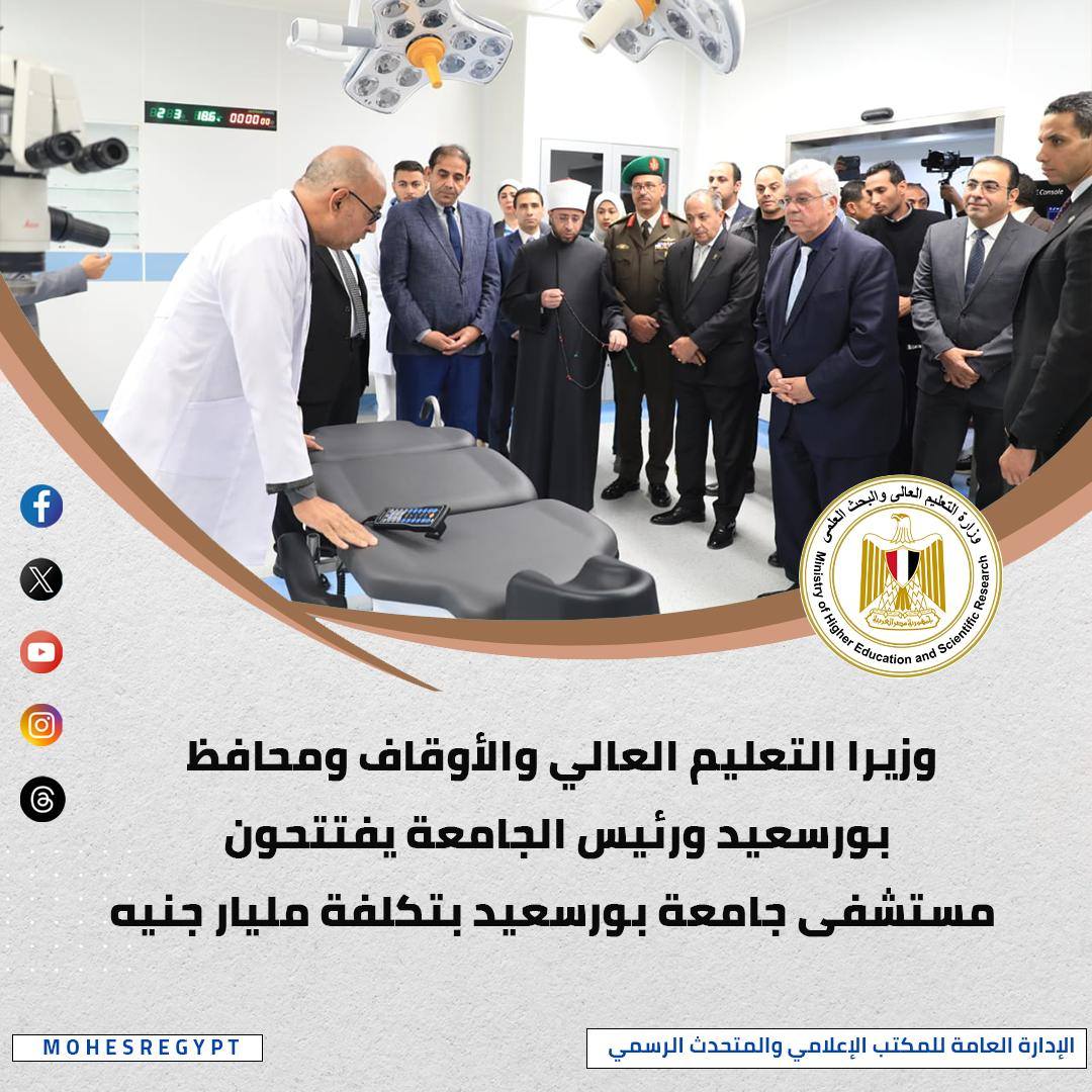 افتتح الدكتور أيمن عاشور وزير التعليم العالي والبحث العلمي، مستشفى جامعة بورسعيد، وخلال الزيارة، اطلع الوزير على منشآت مستشفى جامعة بورسعيد، الذي يمتد على مساحة إجمالية تصل إلى 36 ألف متر مربع، مع بنية إنشائية تبلغ 13.5 ألف متر مربع، ويتكون المشروع من ثلاثة مبانٍ رئيسية بارتفاع خمسة أدوار، وتم تجهيز المستشفى بـ540 سريرًا، منها 427 سريرًا للإقامة و113 سريرًا للعزل والإفاقة والعناية المركزة والطوارئ، بالإضافة إلى 16 غرفة عمليات، 31 عيادة، 6 غرف مناظير، 5 معامل، و15 غرفة أشعة، و15 قاعة محاضرات، وأكد الوزير أن قطاع الرعاية الصحية في مصر يشهد تطورًا ملحوظًا بفضل الجهود غير المسبوقة التي تبذلها الدولة المصرية لتحديث وتطوير منظومة المستشفيات الجامعية، بما يتماشى مع أحدث المعايير العالمية.