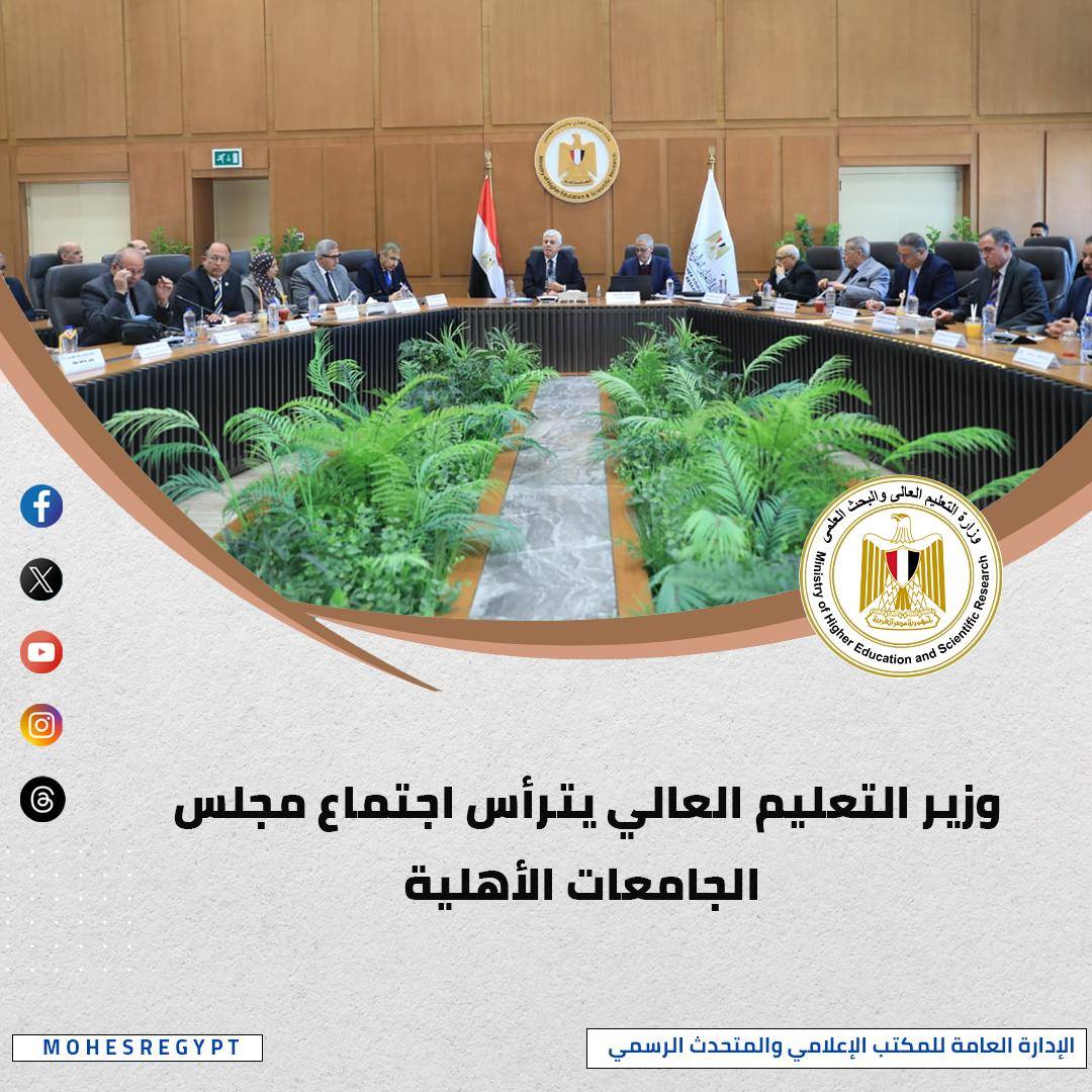 ترأس الدكتور أيمن عاشور وزير التعليم العالي والبحث العلمي، اجتماع مجلس الجامعات الأهلية، وخلال الاجتماع وافق المجلس على طلب جامعة حلوان الأهلية بتغيير مسماها إلى "جامعة العاصمة الأهلية"، كما وافق المجلس على طلب جامعة جنوب الوادي الأهلية بتغيير مسماها إلى "جامعة قنا الأهلية"، كما وافق المجلس على فتح باب التقديم للقبول والتسجيل بالفصل الدراسي الثاني للعام الجامعي 2025/2026، في حدود الأماكن الشاغرة بالجامعات التي تسمح لوائحها الداخلية بذلك، وذلك اعتبارًا من 10 يناير 2026، ولمدة أسبوعين.