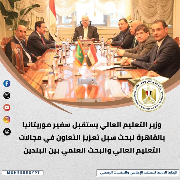 استقبل د.أيمن عاشور وزير التعليم العالي والبحث العلمي، السفير الحسين سيدي عبد الله الدية سفير موريتانيا بالقاهرة؛ لبحث سبل التعاون بين مصر وموريتانيا فى المجالات التعليمية والبحثية، وخلال اللقاء، بحث الجانبان سبل تعزيز التعاون التعليمي والبحثي بين البلدين، مع التركيز على دعم الطلاب الموريتانيين بالجامعات المصرية، وتذليل التحديات التي تواجههم، وإمكانية زيادة المنح الدراسية المقدمة للطلاب الموريتانيين، بالإضافة إلى تعزيز التعاون في المشروعات البحثية ذات الاهتمامات المشتركة.