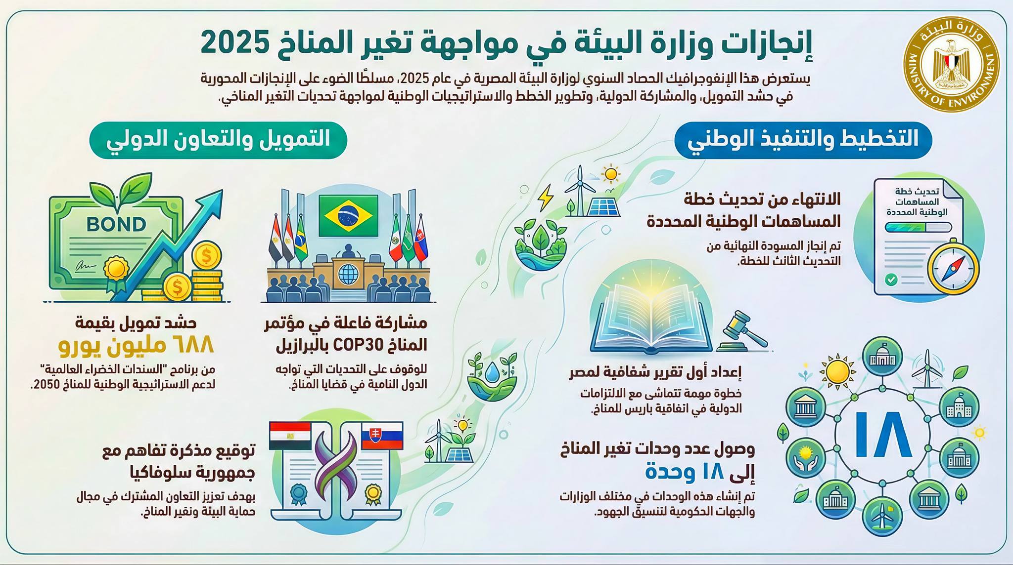 واستعرض التقرير أيضاً تقدم مصر في تنفيذ التزامات المناخ، وإعلان الانتهاء من المسودة النهائية من التحديث الثالث لخطة المساهمات الوطنية المحددة NDC3.0، بالإضافة إلى التحركات الدبلوماسية الداعمة للعمل المناخي العالمي ولقاءات رفيعة المستوى التى تمت لدعم أولويات التكيف، والتمويل المناخي، والعدالة المناخية للدول النامية ، علاوة على الانتهاء من اعداد تقرير الشفافية الاول لمصر ، و تقرير الابلاغ الوطنى الرابع وجارى اتخاذ اجراءات الاعتماد تمهيداً لتقديمه الى اتفاقية تغير المناخ والعمل على إعداد مشروع "الخطة الوطنية للتكيف في مصر (NAP) والذي يهدف إلى تعزيز القدرات الوطنية والبشرية والمؤسسية للتكيف مع التغيرات المناخية وتحديد الأولويات ودمجها فى الموازنة والتخطيط.
