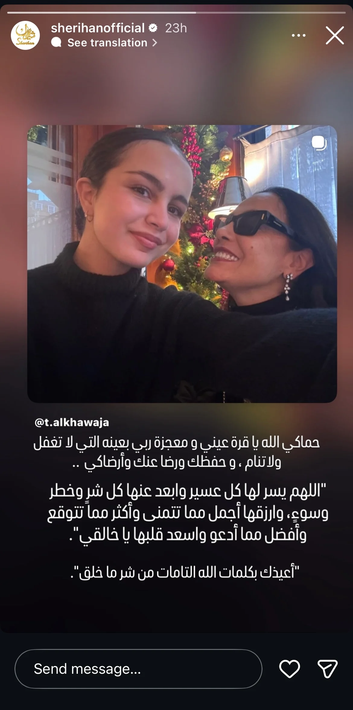 وأضافت شريهان لمنشورها: "اللهم يسر لها كل عسير وابعد عنها كل شر وخطر وسوءٍ وارزقها أجمل مما تتمنى وأكثر مما تتوقع وأفضل مما أدعو واسعد قلبها يا خالقي".