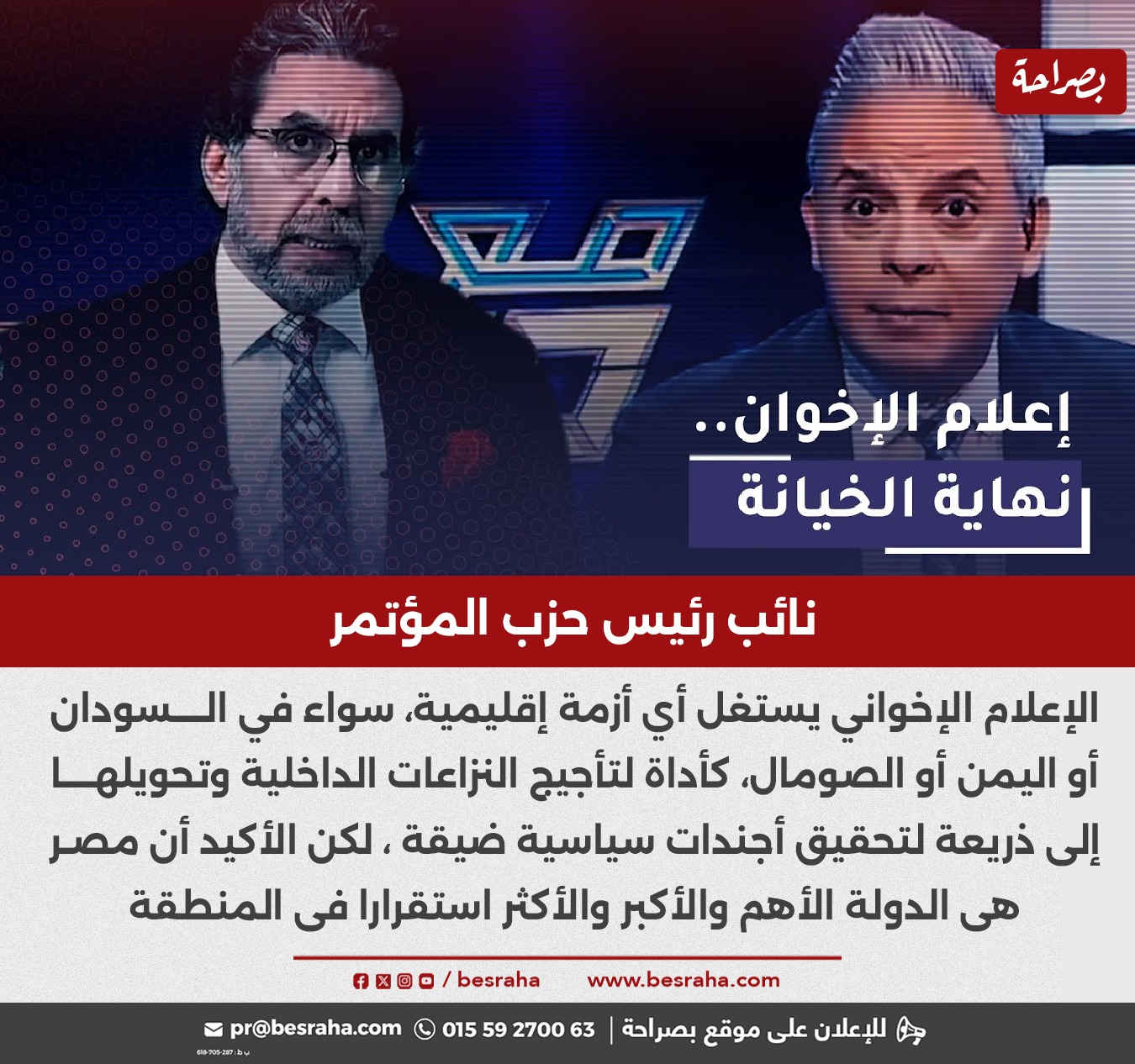 وأضاف فرحات أن الإعلام الإخواني يستغل أي أزمة إقليمية، سواء في السودان أو اليمن أو الصومال، كأداة لتأجيج النزاعات الداخلية وتحويلها إلى ذريعة لتحقيق أجندات سياسية ضيقة من خلال التركيز على تضخيم الخلافات وإخفاء أي جهود حقيقية للتهدئة أو الحلول السياسية، وهو ما يسهم في زيادة حالة العداء بين الشعوب العربية بدلا من تعزيز التكامل الإقليمي ودعم الاستقرار.