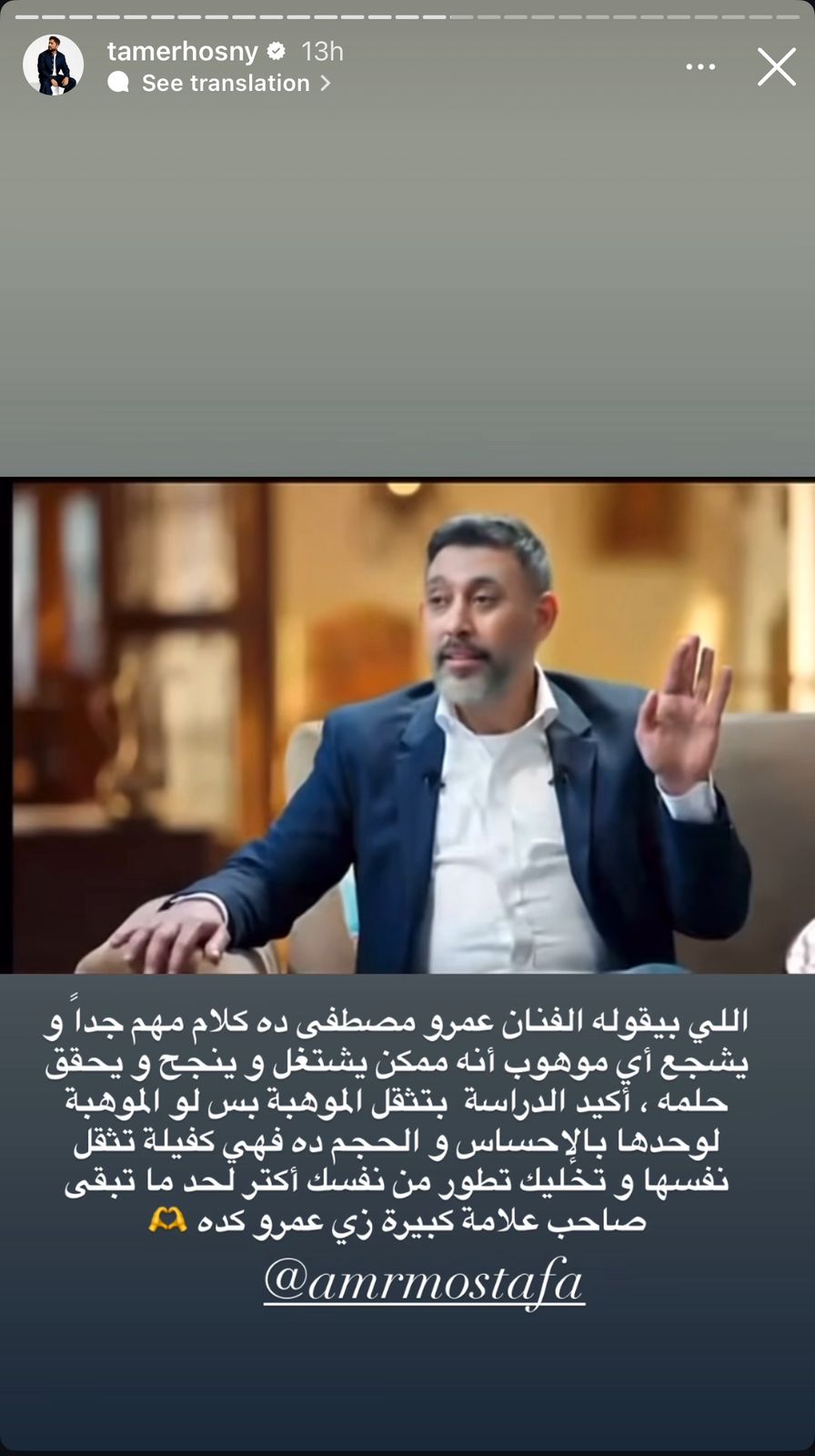 ونشر تامر حسني «ستوري» عبر حسابه الرسمي على موقع التواصل الاجتماعي إنستجرام، أوضح فيها أن ما يطرحه عمرو مصطفى من أفكار يمنح الأمل لأي صاحب موهبة صادقة، ويؤكد أن العمل المستمر والاجتهاد قادران على صناعة النجاح.