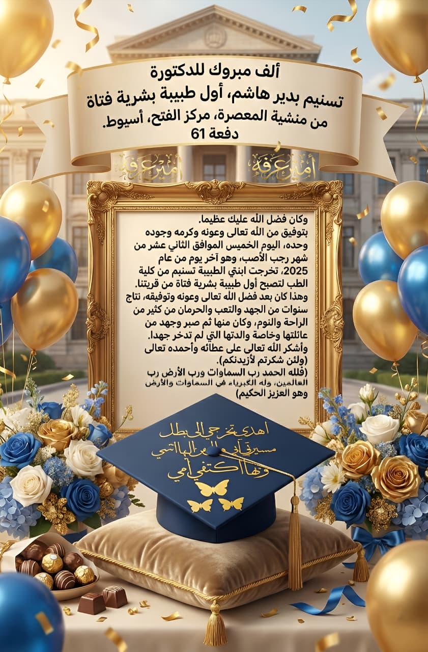 لم يكن يوم الأربعاء، الموافق 31 ديسمبر، مجرد ورقة سقطت من رزمانة عام 2025 في جامعة أسيوط، بل كان يومًا للتاريخ، يومًا تحولت فيه "دموع التعب" إلى "لآلئ فرح" تزين وجوه 850 أسرة مصرية. فبينما كانت الزغاريد تشق سماء الحرم الجامعي احتفالًا بانتهاء ماراثون امتحانات الدفعة 61 طب بشري، كانت هناك "زغرودة" مختلفة لها طعم الانتصار الخاص، انطلقت من قلب قرية "منشية المعصرة" بمركز الفتح، لتعلن ميلاد عهد جديد.