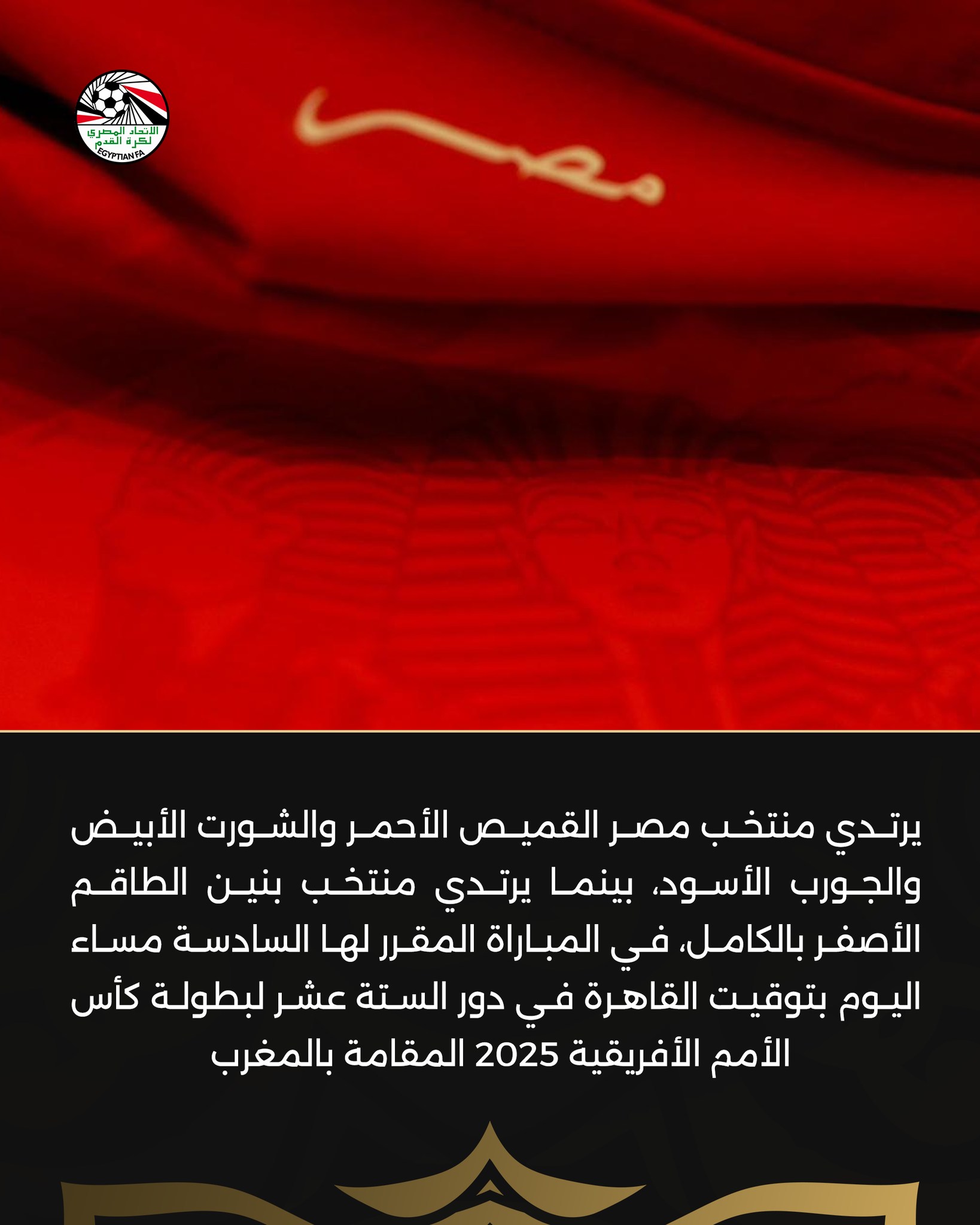 يرتدي منتخب مصر القميص الأحمر والشورت الأبيض والجورب الأسود، في مواجهة بنين اليوم في ثمن نهائي أمم إفريقيا 2025.