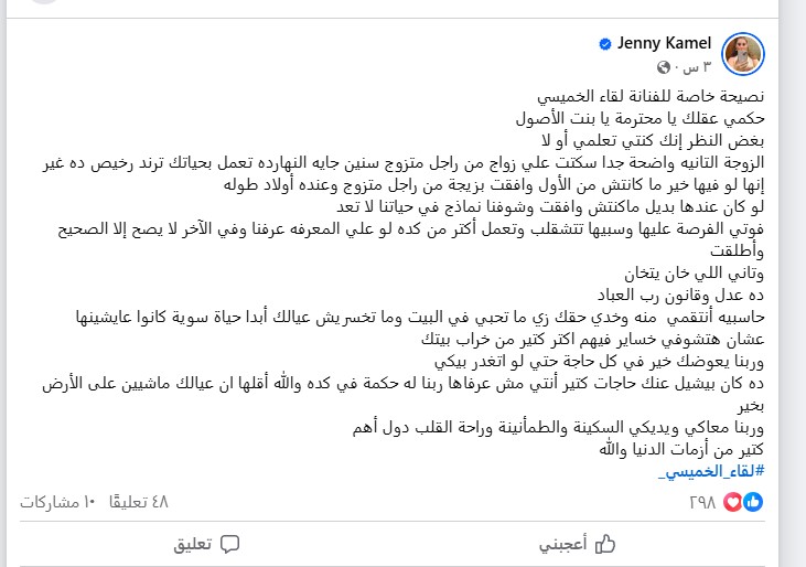 وكتبت جيني عبر حسابها الشخصي بموقع التواصل الاجتماعي فيسبوك: "نصيحة خاصة للفنانة لقاء الخميسي : احكمي عقلك يا محترمة يا بنت الأصول، بغض النظر إنك كنتِ تعلمين أو لا".