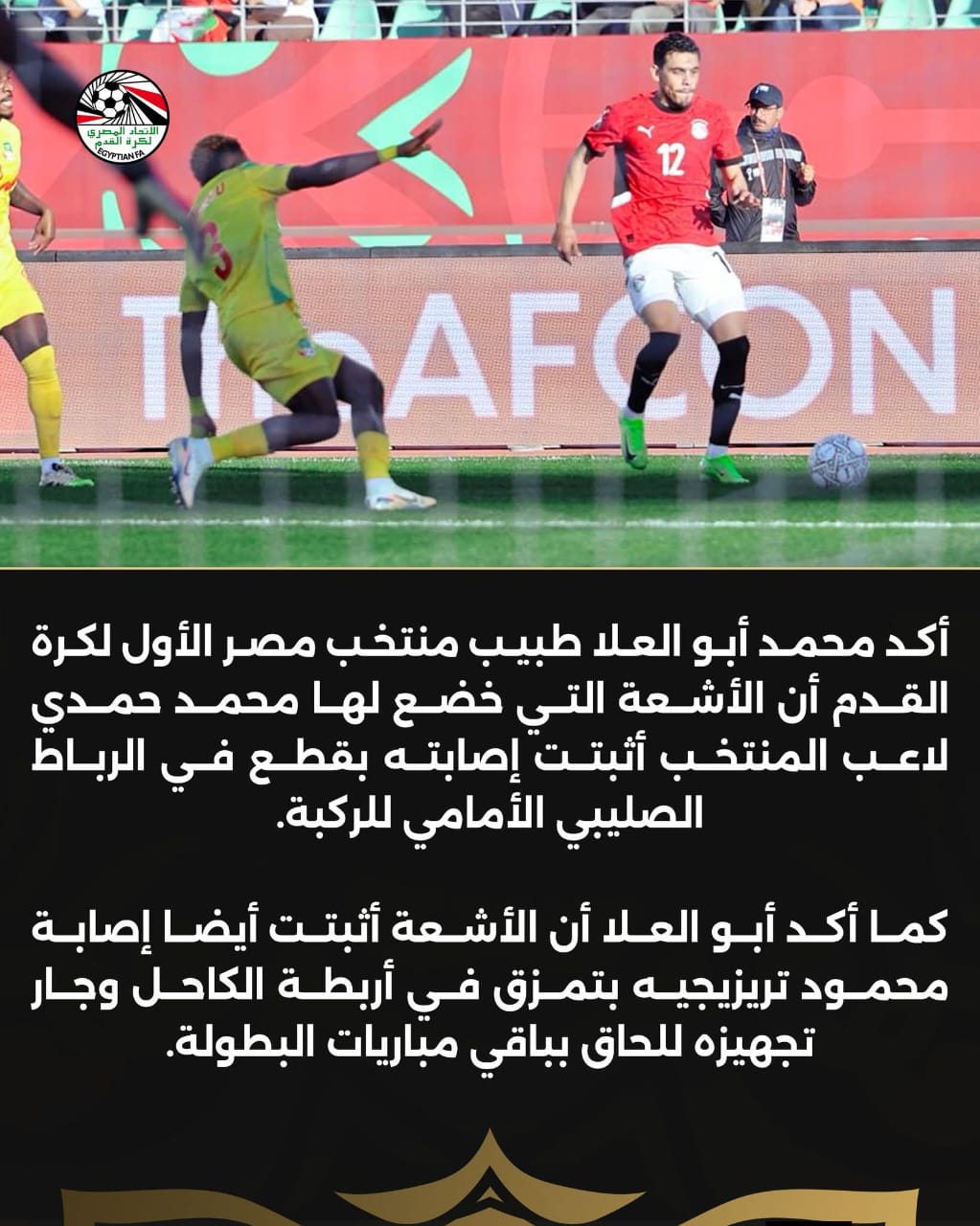 أكد الدكتور محمد أبو العلا، طبيب منتخب مصر الأول لكرة القدم، أن الأشعة الطبية التي أجريت للاعب محمد حمدي أثبتت إصابته بقطع في الرباط الصليبي الأمامي للركبة.
