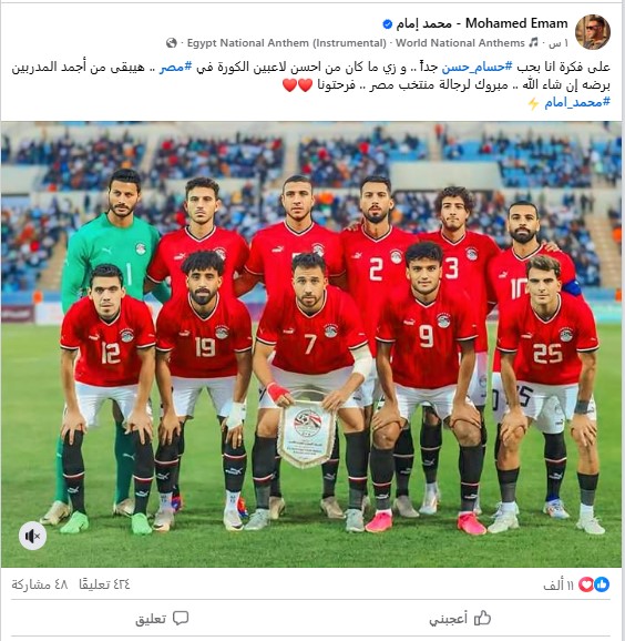 حرص الفنان محمد إمام على دعم منتخب مصر، عقب فوزه اليوم على منتخب بنين، وذلك من خلال منشور عبر حسابه الرسمي على موقع التواصل الاجتماعي «فيس بوك».