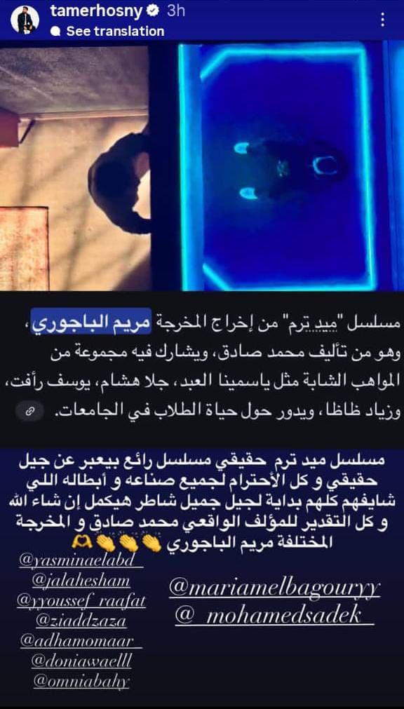وكتب تامر حسني منشورا من خلال خاصية "الاستوري" عبر حسابه الرسمي بموقع تبادل الصور والفيديوهات "انستجرام"، وعلق عليه قائلا: “مسلسل ميدترم حقيقي مسلسل رائع بيعبر عن جيل حقيقي، وكل الاحترام لجميع صناعه وأبطاله اللي شايفنهم كلهم بداية لجيل جميل شاطر هيكمل إن شاء الله، وكل التقدير للمؤلف الواقعي محمد صادق، والمخرجة المختلفة مريم الباجوري”.