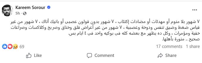 وكتب كريم سرور منشورا عبر صفحته الرسمية بموقع "فيسبوك"، والذي جاء كالتالي: “7شهور بلا منوم أو مهدئات أو مضادات إكتئاب ، 7شهور بدون قولون عصبى أو بانيك أتاك ، 7 شهور من غير قياس ضغط وضيق تنفس ودوخة وعصبية ، 7 شهور من غير أعراض قلق وخناق وصريخ وكلاكسات وصراعات خفية ومؤمرات ، وكل ده يظهر مع بعضه كله فى بوكيه واحد فى4 أيام بس، صحيح منورة بأهلها”.