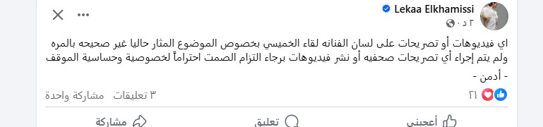 وكتبت الصفحة الرسمية: “أي فيديوهات أو تصريحات على لسان الفنانة لقاء الخميسي بخصوص الموضوع المثار حاليا غير صحيحة بالمرة، لم يتم إجراء أي تصريحات صحفية أو نشر فيديوهات، نرجو احترام خصوصية وحساسية الموقف”.