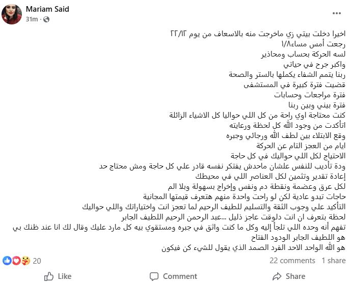 وكتب مريم سعيد صالح عبر صفحتها بموقع “فيسبوك”: "اخيرا دخلت بيتي زي ماخرجت منه بالاسعاف من يوم 22/12 رجعت أمس مساء 1/8 لسه الحركة بحساب ومحاذير، واكبر جرح في حياتي، ربنا يتمم الشفاء يكملها بالستر والصحة، قضيت فترة كبيرة في المستشفى ، فترة مراجعات وحسابات، فترة بيني وبين ربنا".