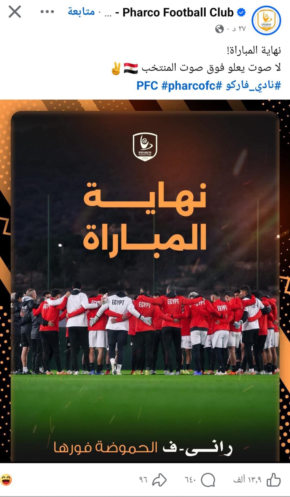 وعلّق الحساب الرسمي لنادي فاركو عبر «فيسبوك» على خسارته أمام الأهلي، قائلًا: «نهاية المباراة، لا صوت يعلو فوق صوت المنتخب».