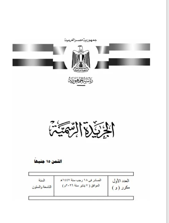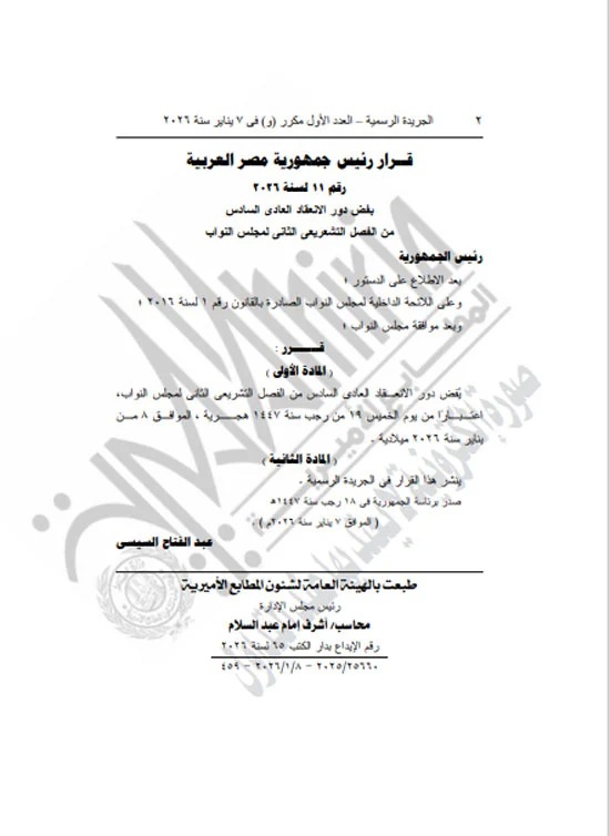 نشرت الجريدة الرسمية قرار الرئيس عبد الفتاح السيسى، رقم 11 لسنة 2036 بفض دور الانعقاد العادى السادس من الفصل التشريعى الثانى لمجلس النواب، اعتبارا من يوم الخميس 19 من رجب سنة 1447 هجرية، الموافق 8 من بناير سنة 2026 ميلادية.