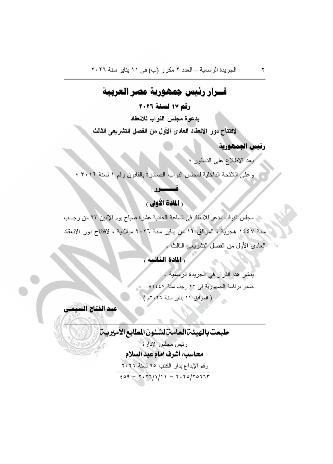 نشرت الجريدة الرسمية قرار الرئيس عبد الفتاح السيسى، رقم 17 لسنة 2026 بدعوة مجلس النواب للانعقاد لافتتاح دور الانعقاد العادى الأول من الفصل التشريعى الثالث فى الساعة الحادية عشرة صباح يوم الإثنين ٢٣ من رجب سنة ١٤٤٧ هجرية ، الموافق ١٢ من يناير سنة ٢٠٢٦ ميلادية.
