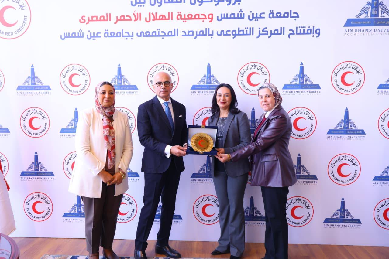 شهدت الدكتورة مايا مرسي وزيرة التضامن الاجتماعي نائبة رئيس الهلال الأحمر المصري، والدكتور محمد ضياء زين العابدين رئيس جامعة عين شمس توقيع برتوكول تعاون بين الهلال الأحمر المصري وجامعة عين شمس، كما افتتحا المركز التطوعي والمرصد المجتمعي لجامعة عين شمس بالتعاون مع الهلال الأحمر المصري.