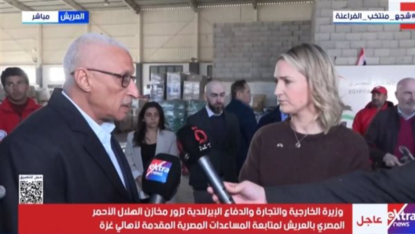 زارَت وزيرة الخارجية والتجارة والدفاع الإيرلندية مخازن الهلال الأحمر المصري بمدينة العريش، للاطلاع على جهود مصر في تجهيز المساعدات الإنسانية لأهالي قطاع غزة.