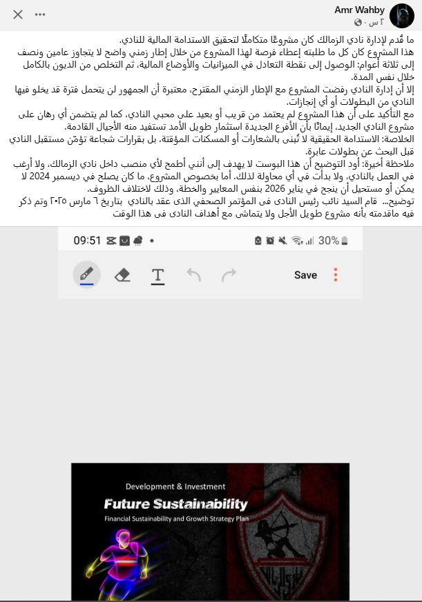 وقال عمرو وهبي عبر حسابه الشخصي على موقع التواصل الاجتماعي «فيسبوك»: «ما قُدم لإدارة نادي الزمالك كان مشروعًا متكاملًا لتحقيق الاستدامة المالية للنادي».