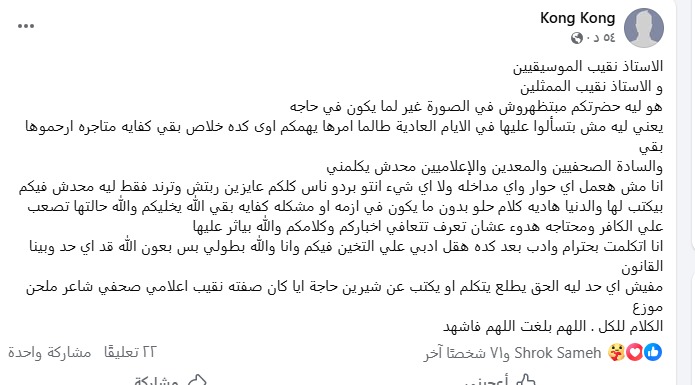 هاجم محمد عبدالوهاب شقيق الفنانه شيرين عبد الوهاب نقيبي المهن الموسيقيه والمهن التمثيليه بعد تدخلهم لحل ازمة شقيقته.