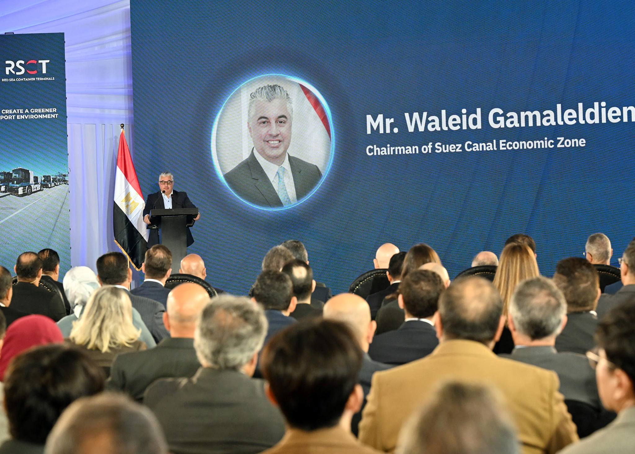 وفي بداية كلمته، عبر وليد جمال الدين عن ترحيبه بالحضور اليوم في ميناء السخنة بالمنطقة الاقتصادية لقناة السويس للاحتفال بهذه المناسبة الاستثنائية، التي تأتي بالتزامن مع قرب الانتهاء الكامل من تطوير ميناء السخنة، وتحقيق أرقام قياسية عالمية في أعمال التطوير، مشيراً إلى أننا نحتفل اليوم ببدء وانطلاق التشغيل التجاري لمشروع (محطة البحر الأحمر لتداول الحاويات RSCT)، هذه المحطة الجديدة بميناء السخنة التي تقوم شركة "هاتشيسون" الصينية أحد أكبر مشغلي الموانئ عالميًّا بتشغيلها ضمن تحالف الخطوط الملاحية العالمية COSCO- CMA، حيث يجري تطويرها لتصبح إحدى كبرى محطات الحاويات على مستوى جمهورية مصر العربية، تنفذ على مرحلتين يتم بدء تشغيل المرحلة الاولي منها اليوم بطول رصيف حوالي 1.2 كليو متر، على أن تكون المرحلة الثانية بطول رصيف يصل إلى 1.4 كيلومتر.