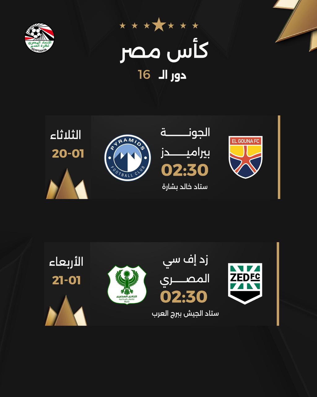 أعلنت إدارة المسابقات بالاتحاد المصري لكرة القدم ، موعد مباراتي الجونة مع بيراميدز ، وزد مع المصري في دور الستة عشر من بطولة كأس مصر موسم 2025-2026