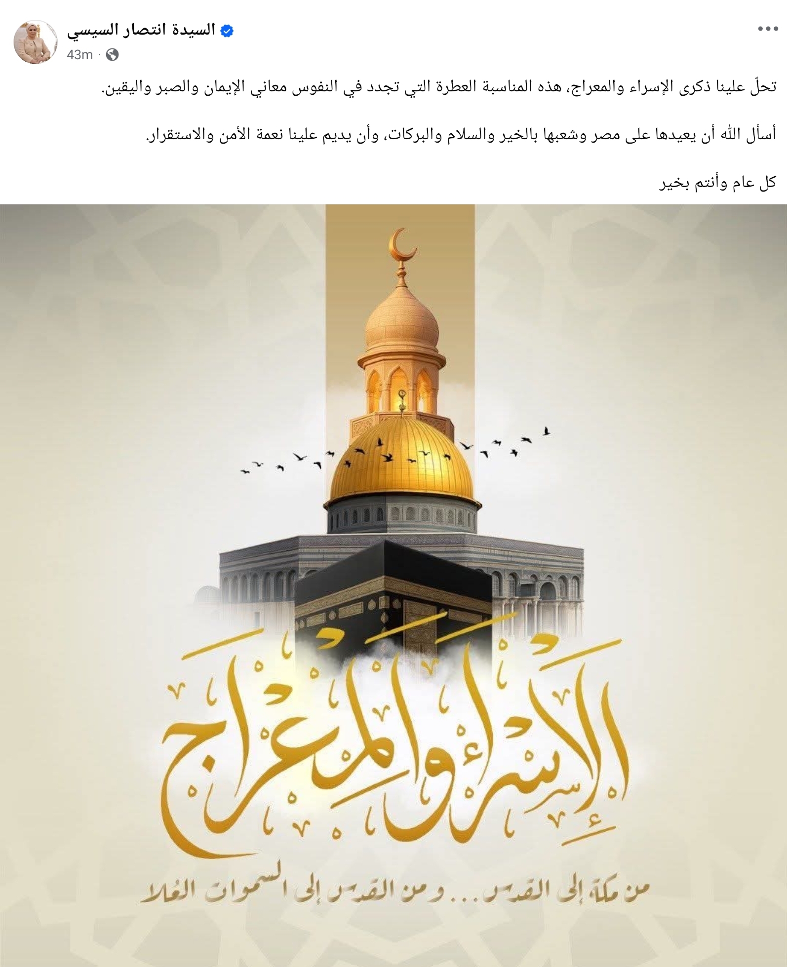 قالت السيدة انتصار السيسى، قرينة رئيس الجمهورية: "تحلّ علينا ذكرى الإسراء والمعراج، هذه المناسبة العطرة التي تجدد في النفوس معاني الإيمان والصبر واليقين.