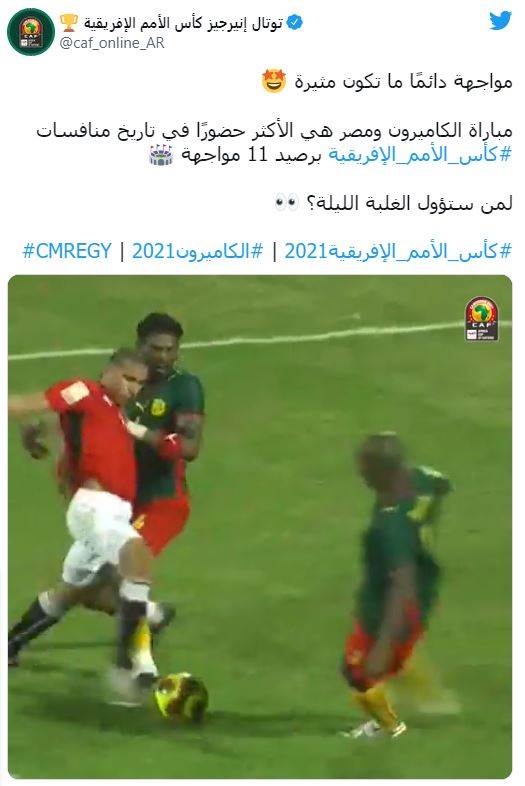 نشر الحساب الرسمي لاتحاد الأفريقي لكرة القدم عبر تويتر فيديو لمواجهات مصر والكاميرون وعلق بعبارة "مواجهة دائمًا ما تكون مثيرة مباراة الكاميرون ومصر هي الأكثر حضورًا في تاريخ منافسات كأس الأمم الإفريقية برصيد 11 مواجهة”.