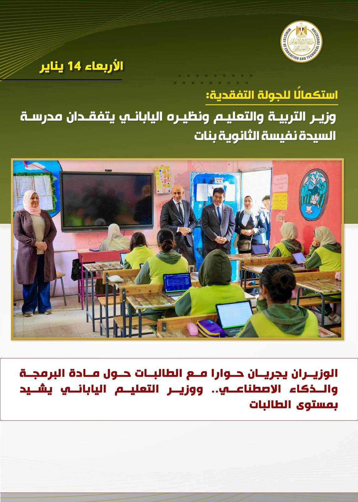 استكمالا للجولة التفقدية التي قام بها محمد عبد اللطيف وزير التربية والتعليم والتعليم الفني، و ماتسوموتو يوهي، وزير التعليم والثقافة والرياضة والعلوم والتكنولوجيا الياباني بالمدرسة المصرية اليابانية، أجرى الوزيران زيارة تفقدية بمدرسة السيدة نفيسة الثانوية بنات التابعة لإدارة شرق مدينة نصر التعليمية.