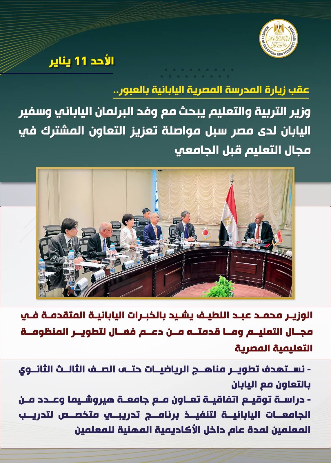 وأكد الوزير أهمية التعاون في دعم المنظومة التعليمية من خلال زيادة عدد الخبراء اليابانيين العاملين في مصر، بما يسهم في نقل الخبرات التعليمية المتقدمة، ودعم التطبيق العملي للنموذج التعليمي الياباني، وتعزيز استدامة الشراكة التعليمية بين الجانبين.