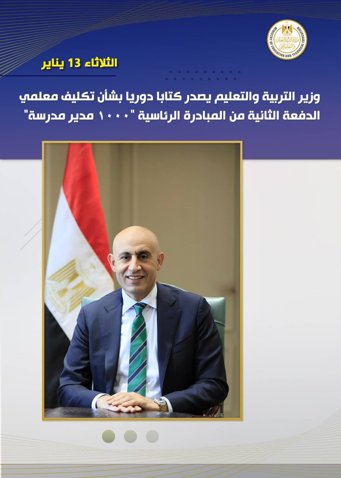 في إطار حرص وزارة التربية والتعليم والتعليم الفني على دعم القيادات التربوية المؤهلة، وتعزيز كفاءة الإدارة المدرسية، وتنفيذ مستهدفات المبادرة الرئاسية لإعداد القيادات التعليمية، أصدر محمد عبد اللطيف، وزير التربية والتعليم والتعليم الفني، كتابًا دوريًا بشأن تكليف المعلمين المقبولين في الدفعة الثانية من المبادرة الرئاسية " ١٠٠٠ مدير مدرسة" لشغل وظيفة مدير مدرسة لمدة عام قابلة للتجديد.