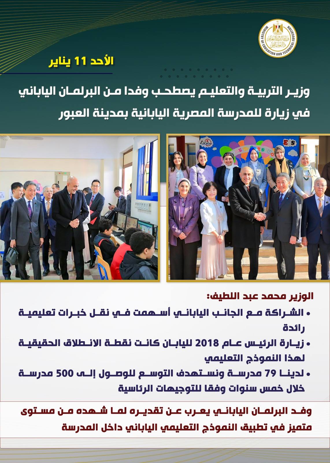 اصطحب محمد عبد اللطيف وزير التربية والتعليم والتعليم الفني وفدا رفيع المستوى من البرلمان الياباني في زيارة للمدرسة المصرية اليابانية بمدينة العبور، وذلك للاطلاع على تجربة المدارس المصرية اليابانية والوقوف على آليات تطبيق النموذج التعليمي الياباني داخل المدارس المصرية.