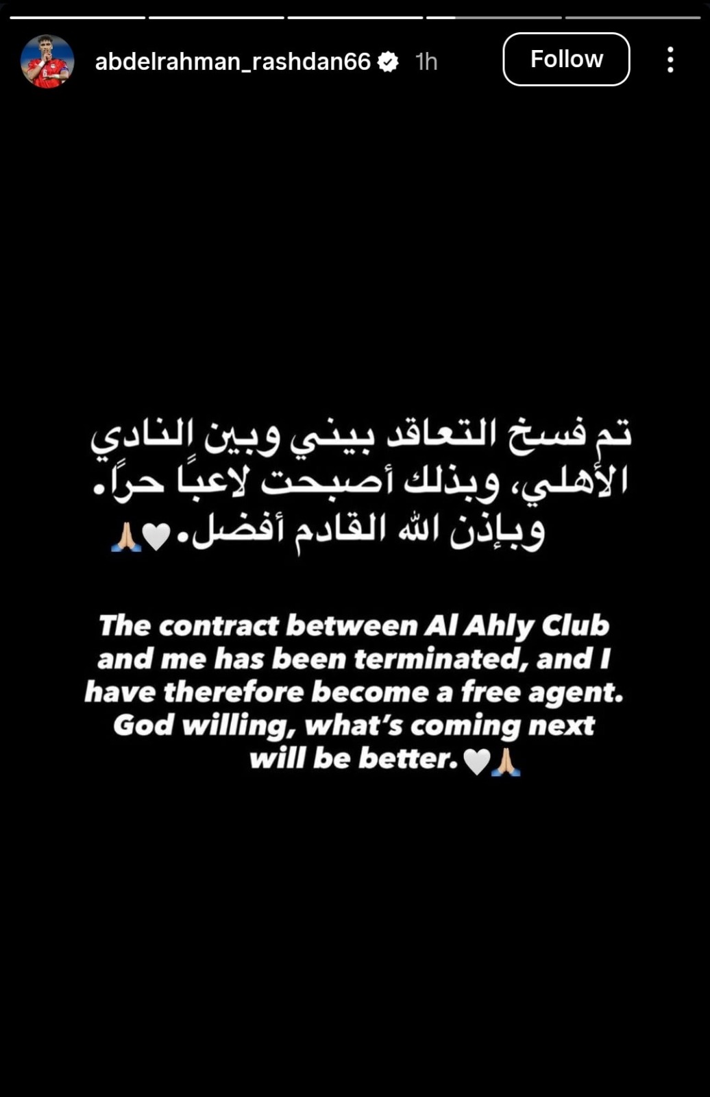 نشر مدافع النادي الأهلي ومنتخب مصر للشباب عبدالرحمن رشدان استوري على انستجرام أعلن فيه فسخ تعاقده مع الشياطين الحمر .