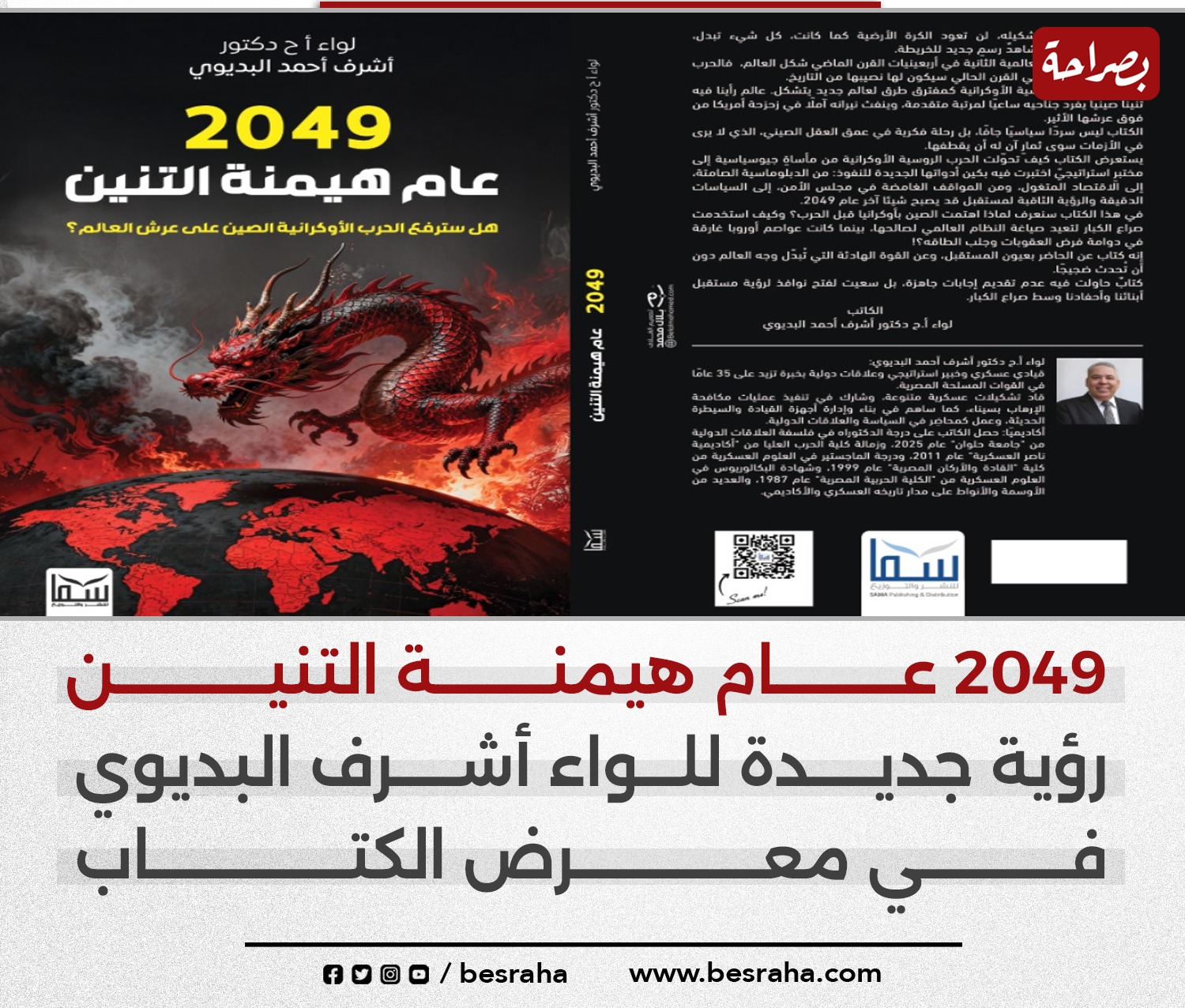 يشارك اللواء أركان حرب دكتور أشرف البديوي في الدورة السابعة والخمسين من معرض القاهرة الدولي للكتاب، بأحدث كتبه الصادر مؤخرا عن دار سما للنشر والتوزيع، بعنوان "2049.. عام هيمنة التنين"، في 224 صفحة من القطع المتوسط، وثمانية فصول تستعرض رؤية شاملة لرحلة الصعود الصينية نحو القطبية والتنازع على قيادة العالم.