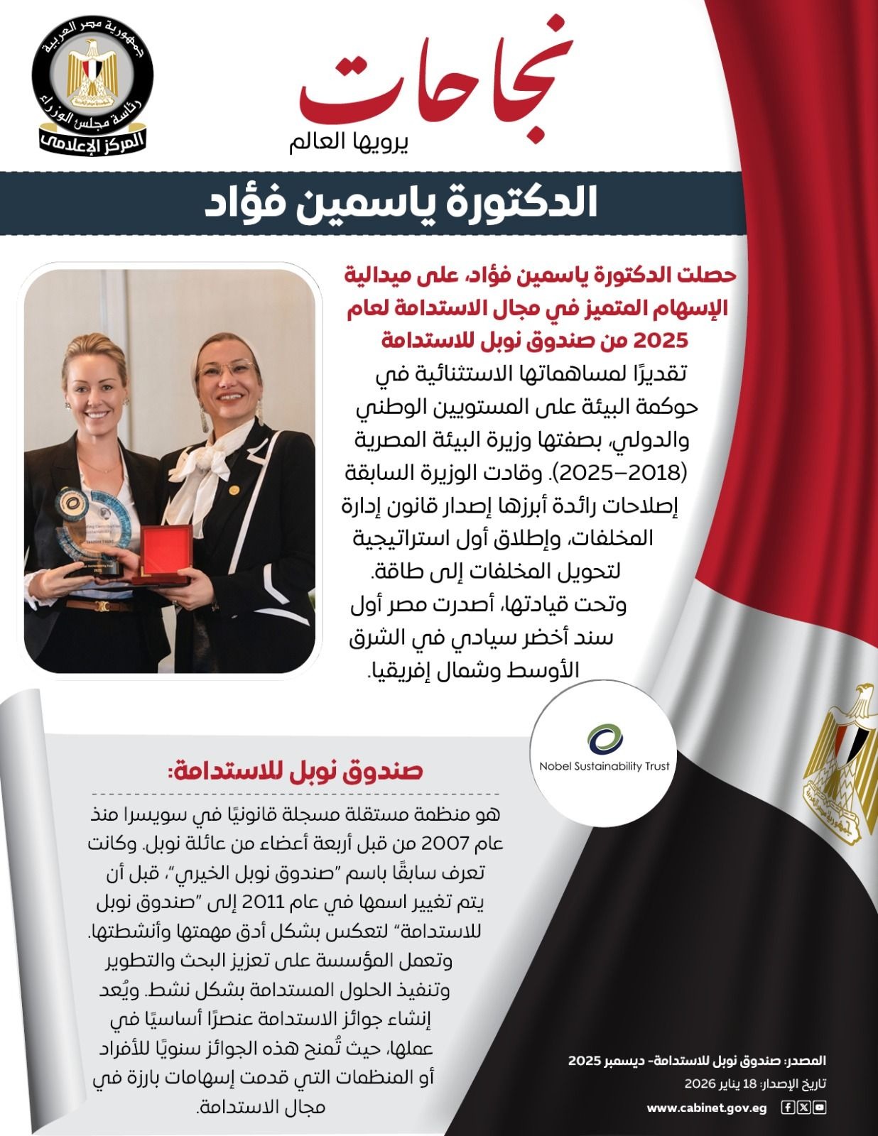 تقديرًا لمساهماتها الاستثنائية في حوكمة البيئة على المستويين الوطني والدولي، حصلت وزيرة البيئة المصرية السابقة، ياسمين فؤاد، على ميدالية الإنجاز البارز من صندوق نوبل للاستدامة لعام 2025، مما يعكس كفاءة وجدارة القيادات المصرية على المستوى العالمي.