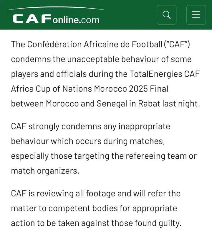أدان الاتحاد الإفريقي لكرة القدم (كاف) السلوك غير المقبول الذي شهدته المباراة النهائية لبطولة كأس الأمم الإفريقية 2025، والتي جمعت بين منتخبي المغرب والسنغال، على ملعب مولاي الأمير عبد الله في العاصمة الرباط.
