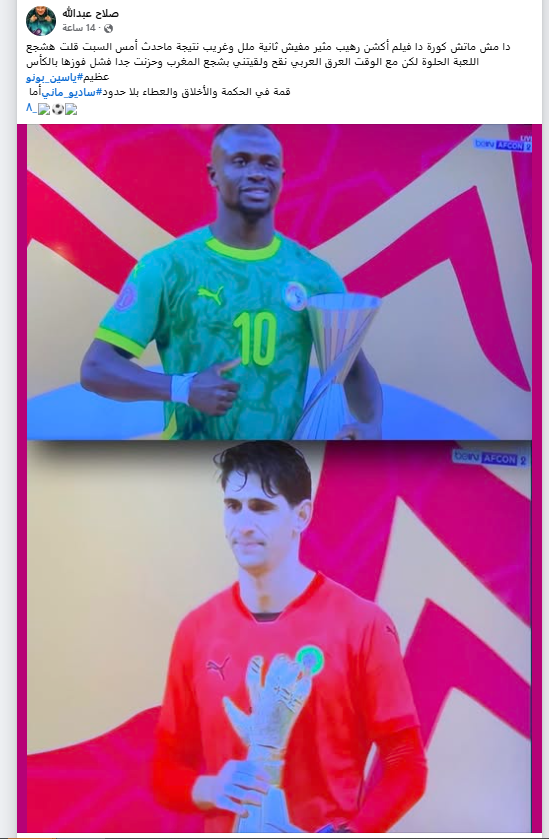 علق الفنان صلاح عبد الله على الأحداث التي شاهدها في مباراة نهائي الأمم الأفريقية بين منتخبي المغرب والسنغال والتي انتهت بتتويج أسود التيرانجا بعد الفوز بهدف نظيف على أسود الأطلس، مؤكدًا أن ما شهده النهائي يعد فيلمًا سينمائيًا وليس مباراة كرة قدم.