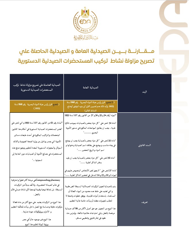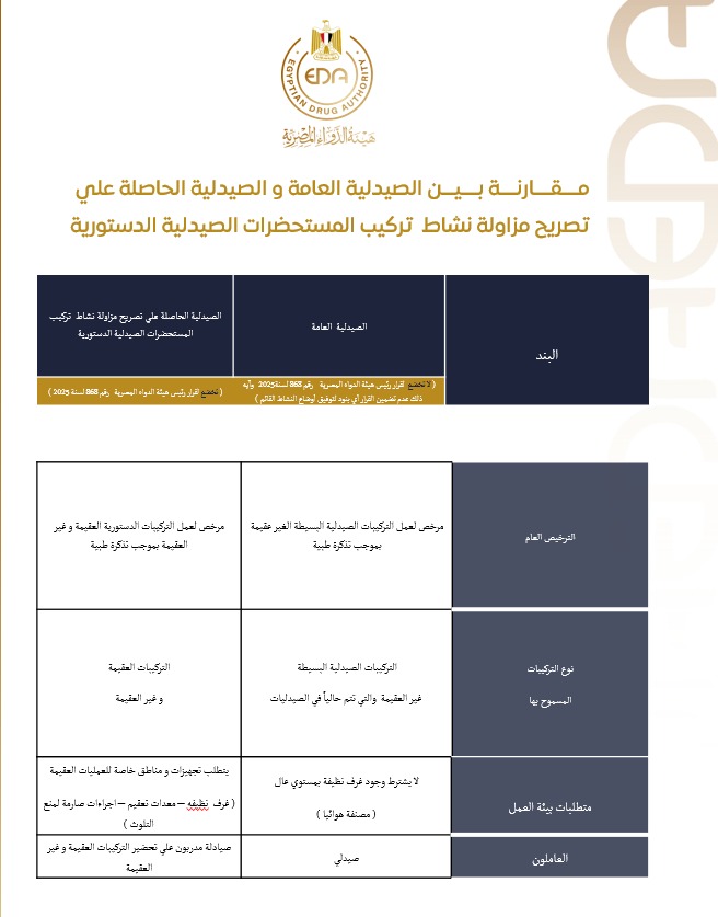 أكدت هيئة الدواء المصرية، عبر الدكتور ياسين رجائي، مساعد رئيس الهيئة، أن الصيدليات والمعامل المشار إليها في قرار هيئة الدواء رقم 868 لسنة 2025 بشأن تنظيم التركيبات الصيدلية غير موجودة حاليًا في السوق الدوائية المصرية، وأوضحت الهيئة أن القرار يأتي استباقيًا لتنظيم هذا النوع من النشاط مستقبلاً، ووضع إطار قانوني واضح يضمن ترخيصه بشكل سليم عند إنشائه.