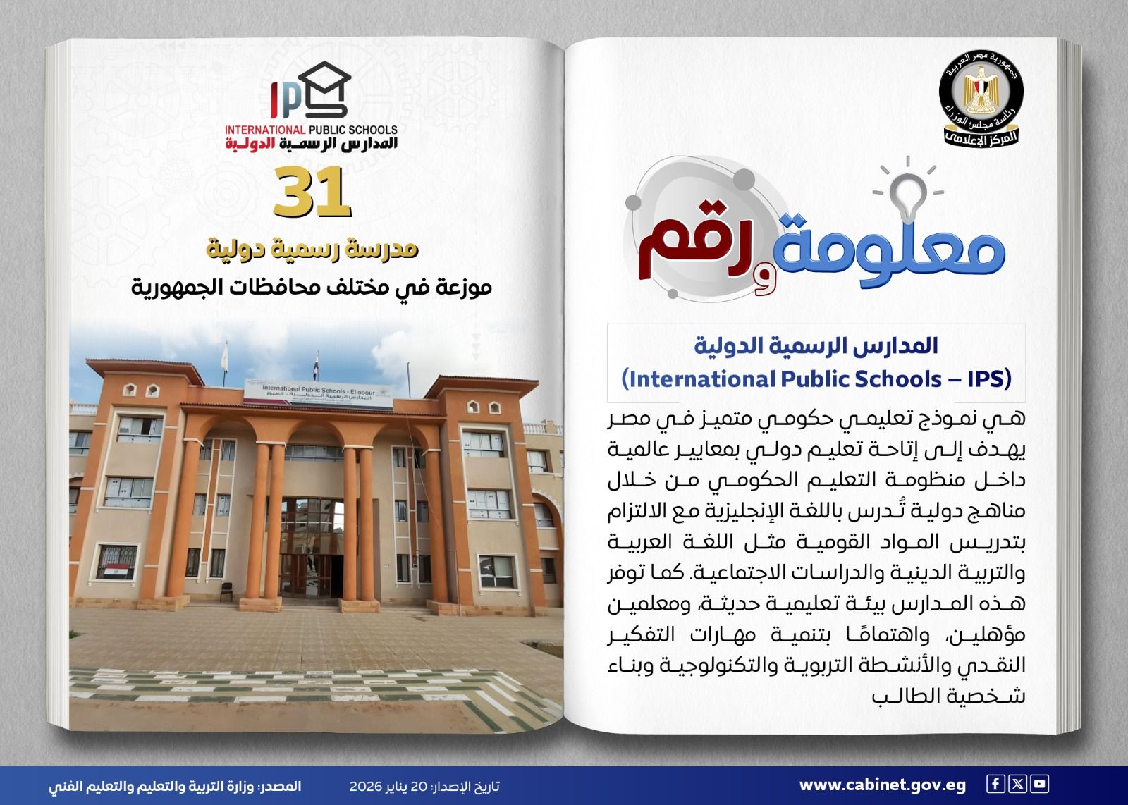 في إطار جهود تطوير منظومة التعليم الحكومي ورفع جودته وفق معايير عالمية، أعلنت وزارة التربية والتعليم عن فتح باب التقديم للمدارس الرسمية الدولية (IPS) للمرحلة الأولى من رياض الأطفال (KG1) للعام الدراسي 2026–2027.