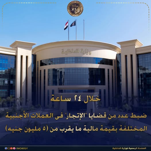 وفي سياق اخر، استمرارًا للضربات الأمنية الموجهة لمكافحة جرائم الاتجار غير المشروع بالنقد الأجنبي والمضاربة بأسعار العملات من خلال إخفائها عن التداول أو التعامل بها خارج نطاق السوق المصرفي، وما يترتب على ذلك من آثار سلبية على الاقتصاد القومي، تمكن قطاع الأمن العام بالتنسيق مع الإدارة العامة لمكافحة جرائم الأموال العامة ومديريات الأمن خلال 24 ساعة من ضبط عدد من القضايا المتعلقة بالاتجار بالعملات الأجنبية المختلفة، بقيمة مالية تُقدّر بنحو 7 ملايين جنيه، وتم اتخاذ الإجراءات القانونية اللازمة حيال الوقائع المضبوطة.