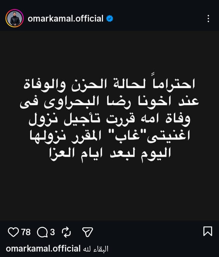 وكتب عمر كمال عبر حسابه الرسمي بموقع التواصل الاجتماعي «انستجرام»: احتراما لحالة الحزن والوفاة عند أخونا رضا البحراوي في وفاة أمه، قررت تأجيل نزول أغنيتي “غاب” المقرر نزولها اليوم لبعد أيام العزا.
