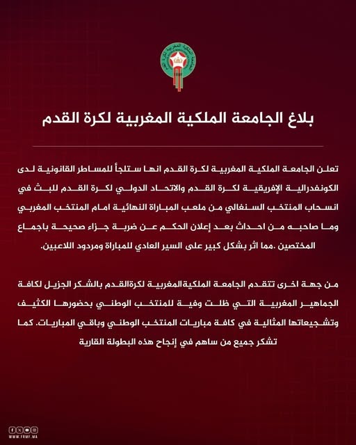 وأكدت الجامعة في بيانها الرسمي:"تعلن الجامعة الملكية المغربية لكرة القدم أنها ستلجأ للمساطر القانونية لدى الكونفدرالية الإفريقية لكرة القدم والاتحاد الدولي لكرة القدم للبث في انسحاب المنتخب السنغالي من ملعب المباراة النهائية أمام المنتخب المغربي، وما صاحبه من أحداث بعد إعلان الحكم عن ضربة جزاء صحيحة بإجماع المختصين، ما أثر بشكل كبير على السير العادي للمباراة ومردود اللاعبين."