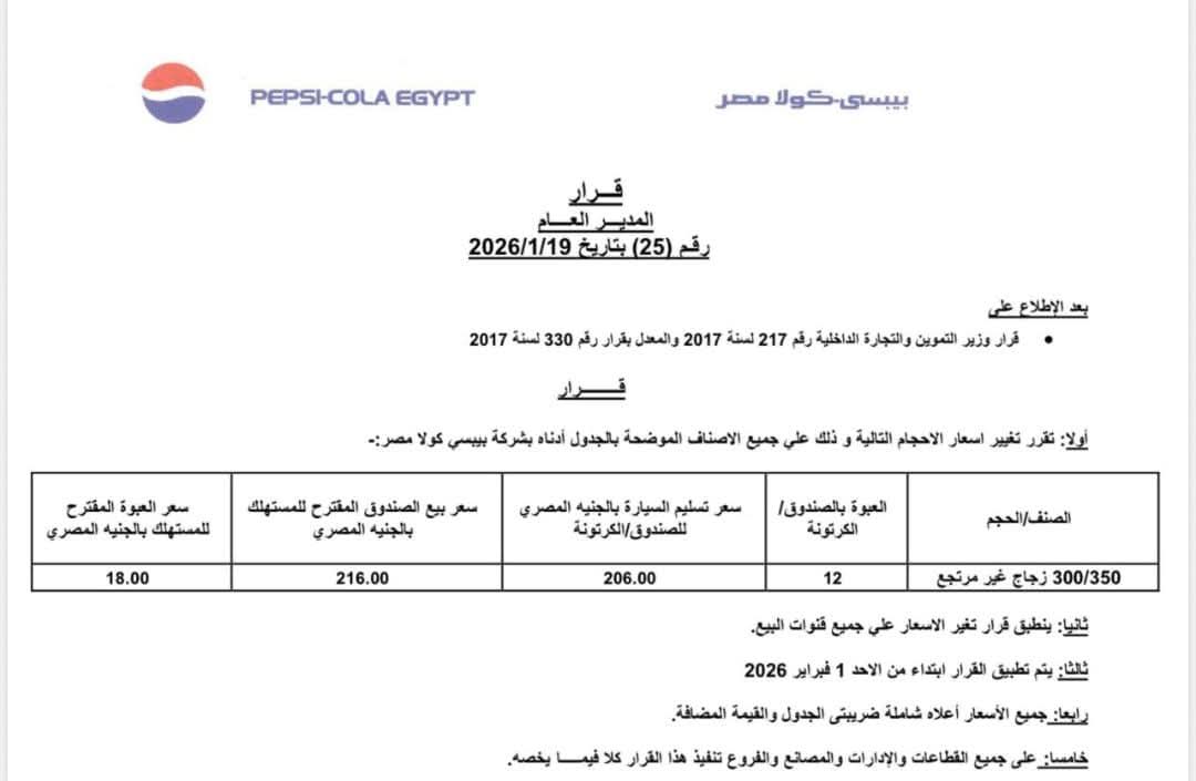 وزارة التموين تعلن تعديل أسعار عبوات “بيبسي كولا” اعتبارًا من 1فبراير 2026