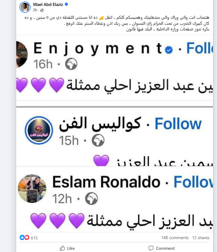 وكتب وائل عبد العزيز على حسابه الشخصي بموقع التواصل الاجتماعي "فيسبوك": "هتتجاب أنت واللي وراك واللي مشغلينك وهحبسكم كلكم، اتقل ده أنا مستني اللقطة دي من 5 سنين وده كان كبيرك الضرب من تحت الحزام زي النسوان".