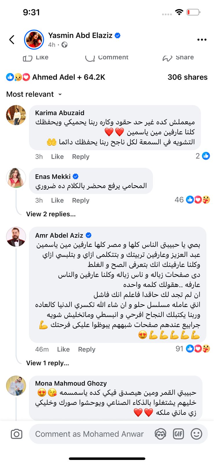 وكتب الفنان عمرو عبد العزيز تعليقاً (كومنت) على المنشور الذي نشرته الفنانة ياسمين عبد العزيز على حسابها الشخصي بموقع التواصل الاجتماعي "فيسبوك": "بصي يا حبيبتي الناس كلها ومصر كلها عارفين مين ياسمين عبد العزيز وعارفين تربيتك وبتتكلمي إزاي وبتلبسي إزاي، وكلنا عارفينك أنك بتعرفي الصح والغلط ".