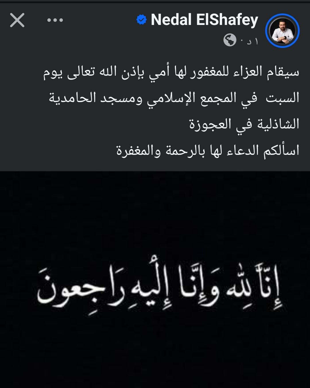 وكانت نضال الشافعي قد أعلن أمس وفاة والدته، حيث كتب عبر حسابه الرسمي بموقع التواصل الاجتماعي “انستجرام”: إنا لله وإنا إليه راجعون توفت إلى رحمة الله أغلى الناس أمي، صلاة الجنازة بعد صلاة الظهر من مسجد آل بهجت دريم لاند، والدفن بمقابر العائلة طريق الواحات، اسألكم الدعاء لها بالرحمة والمغفرة.