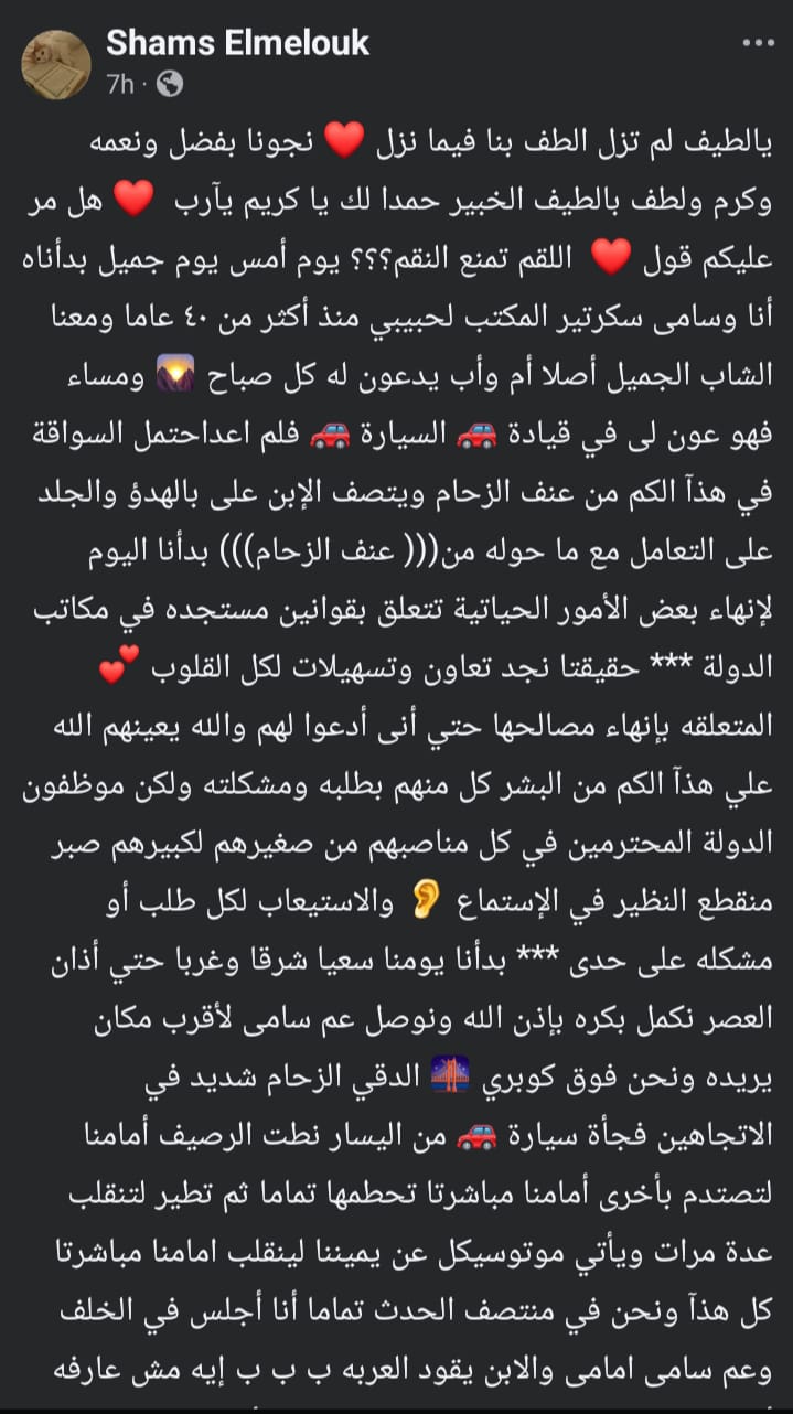 وكتبت شمس البارودي عبر حسابها الخاص بموقع التواصل الاجتماعي “فيسبوك”: يا لطيف لم تزل الطف بنا فيما نزل نجونا بفضل ونعمه وكرم ولطف بالطيف الخبير حمدا لك يا كريم يآرب ، هل مر عليكم قول اللقم تمنع النقم، يوم أمس يوم جميل بدأناه أنا وسامى سكرتير المكتب لحبيبي منذ أكثر من 40 عاما ومعنا الشاب الجميل أصلا أم وأب يدعون له كل صباح ومساء فهو عون لى في قيادة السيارة، فلم اعد احتمل السواقة في هذآ الكم من عنف الزحام".