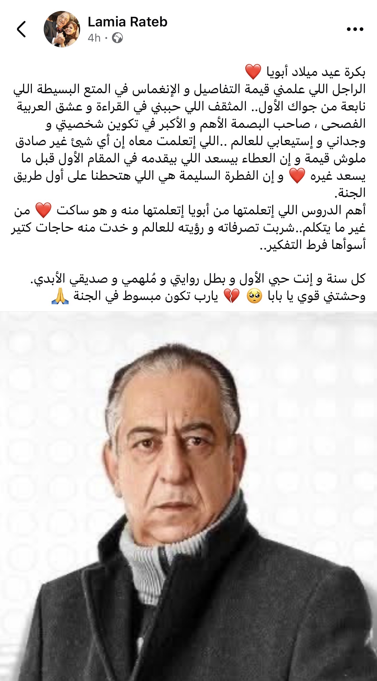 ونشرت لمياء راتب على حسابها الشخصي بموقع التواصل الاجتماعي "فيسبوك": "بكرة عيد ميلاد أبويا، الراجل اللي علمني قيمة التفاصيل والانغماس في المتع البسيطة اللي نابعة من جواك الأول".